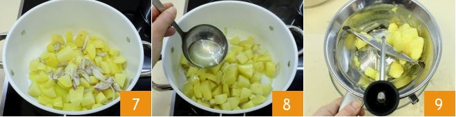 e depois cozinhe em fogo médio em uma panela grande com a cebola picada 7 e um fio de azeite. Adicione o caldo de legumes até cobrir 8 para favorecer o cozimento (levará cerca de 40 minutos). Uma vez prontas, amasse-as com um espremedor de batatas 9