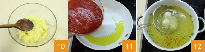 e coloque em uma tigelinha 10. Então prepare também o molho de tomate, despejando o molho em uma frigideira com um fio de azeite 11; cozinhe por cerca de 15 minutos em fogo baixo e quando estiver pronto, ajuste o sal e adicione 3 folhinhas de manjericão fresco. Depois, leve o caldo necessário para o cozimento das almôndegas a ferver e mergulhe algumas de cada vez por alguns minutos 12.