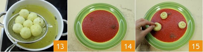 Em seguida, escorra 13 e deixe secar em uma bandeja forrada com papel-toalha. Agora componha seus pratinhos: em cada um, coloque o molho de tomate 14, acomode 3-4 almôndegas e em cada uma coloque uma fatia de azeitona verde sem caroço para simular o olho 15.