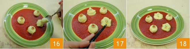Ao lado das almôndegas, coloque uma ou duas colheres de chá de creme de batatas 16 (você também pode usar um saco de confeitar para criar uma nuvem de creme de batatas), modelando na forma de fantasminhas 17 e faça os olhos com sementes de gergelim preto. Aqui está pronta sua receita de almôndegas monstruosas 18!