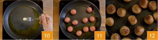 Coloque um fio de óleo em uma panela, acenda o fogo, adicione um dente de alho e deixe dourar 10. Quando começar a dourar, remova-o, adicione as almôndegas 11 e deixe-as dourar bem de todos os lados 12.