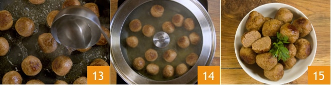 Adicione um pouco de água quente 13, cubra com uma tampa 14 e deixe cozinhar por 10 minutos em fogo baixo. Sirva suas almôndegas ainda quentes 15!