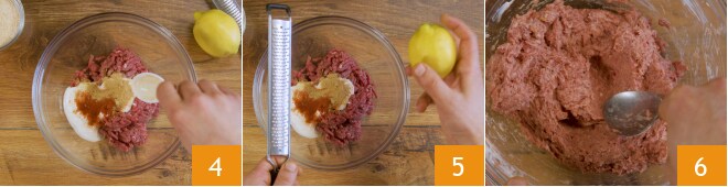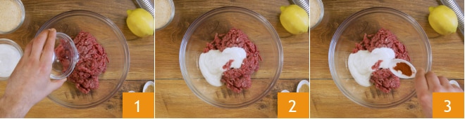 Para preparar as almôndegas sem ovos, coloque a mistura moída em uma tigela. Adicione a água 1 e o iogurte branco 2. Sal e aromatize com a páprica 3,