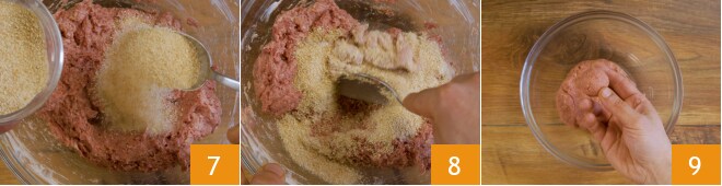 Agora você deve adicionar um pouco de farinha de rosca de cada vez 7, misture novamente 8. Você deve obter uma massa homogênea, macia, mas ao mesmo tempo compacta, então deve ajustar a quantidade exata de farinha de rosca a ser utilizada (você precisará de cerca de 25 g). Forme bolinhas de 30 g cada 9, você obterá cerca de 18.