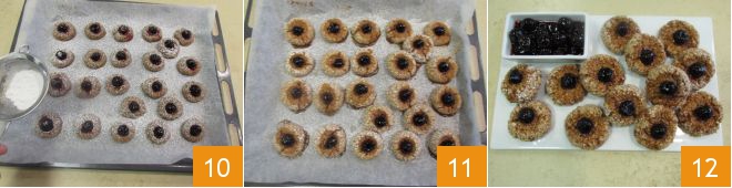 Polvilhe a superfície com açúcar de confeiteiro 10 e asse em forno estático a 160°C por 40 minutos. Quando estiverem assados, retire a assadeira do forno 11, deixe esfriar e depois sirva seus amaretti com cerejas em calda 12.
