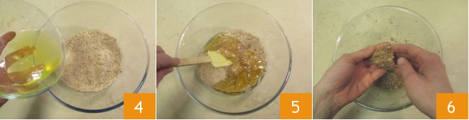 Adicione a clara de ovo 4 e misture com uma espátula 5 para integrar a massa. Agora pegue uma pequena porção de massa do tamanho de uma noz, pesando cerca de 25 g. Forme bolinhas com as mãos 6, você obterá cerca de 24.