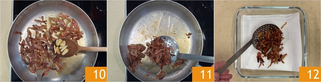 Quando a gordura tiver derretido e a carne estiver crocante e dourada, retire o alho 10 e escorra 11 sobre papel absorvente 12. Descarte metade da gordura e deixe o restante na frigideira.