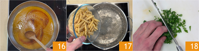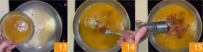 Agora despeje a passata de tomates amarelos na frigideira com o fundo de cozimento 13, depois adicione uma pitada de pimenta calabresa 14, sal e pimenta-do-reino 15.