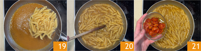 Escorra a massa al dente 19 e salteie rapidamente para incorpore1-la ao molho 20. Com o fogo desligado, junte os tomatinhos confit 21.
