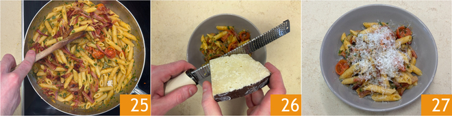 Misture bem 25 e coloque nos pratos, finalizando com uma generosa raspada de pecorino romano ralado 26. Sua amatriciana revisitada com sela de porco e tomatinhos confit este1 pronta para ser degustada 27!