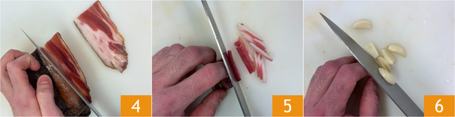 Quando os tomatinhos confit estiverem quase prontos, prossiga com o restante da receita: corte a sela de porco curada primeiro em fatias finas 4, depois em tiras e, por fim, em pedacinhos 5. Fatie tambe9m os dentes de alho 6.