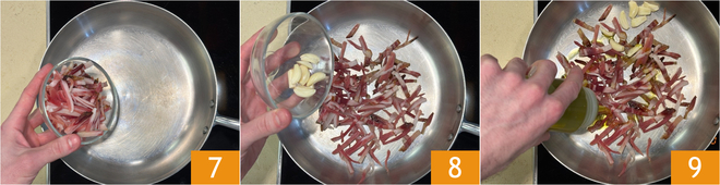 Coloque a sela de porco 7 e o alho numa frigideira 8, acrescente um fio de azeite 9 e doure em fogo me9dio por alguns minutos.