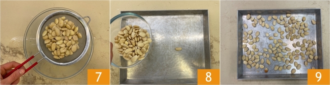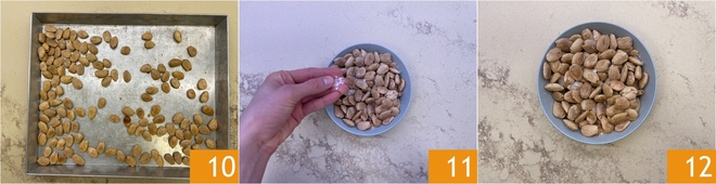 Após o tempo de descanso, escorra as amêndoas 7 e distribua-as em uma assadeira 8. Asse em forno estático a 180° por 15-20 minutos 9.