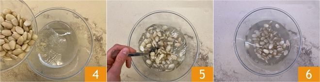 Imersa as amêndoas descascadas na água salgada 4 e misture bem para que todas fiquem cobertas pela água 5. Deixe de molho por toda a noite, ou pelo menos por 12 horas 6.