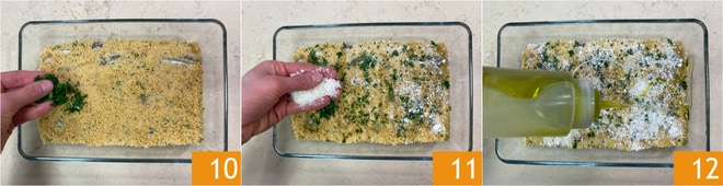 Polvilhe a superfície com a salsa restante 10 e uma pitada de Parmigiano 11, depois regue com um fio de azeite 12.