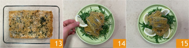 Asse em forno estático a 200°C por 20 minutos 13. Retire do forno e sirva as anchovas sobre uma cama de rúcula, completando com algumas fatias de limão 14. Suas anchovas assadas estão prontas para serem servidas 15!