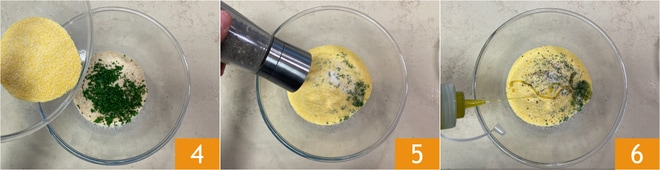 Adicione a farinha de milho 4, ajuste o sal e a pimenta 5, depois acrescente um fio de azeite 6. Misture para incorporar todos os ingredientes.