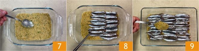 Para preparar as anchovas assadas, primeiro dedique-se à Como limpar as anchovas: remova a cabeça e as vísceras, em seguida, abra-as como um livro e retire a espinha 1. Enxágue em água corrente e reserve. Agora, prepare a crosta: pique a salsa com uma faca 2. Em uma tigela, coloque a farinha de rosca e cerca de três quartos da salsa picada 3.