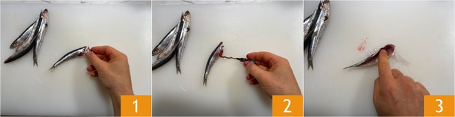 Para preparar as anchovas recheadas, comece com a limpeza: sob um fio d'água, ou em uma tigela cheia de água, retire a cabeça 1, limpe o interior 2 e abra delicadamente a abertura com o dedo 3.
