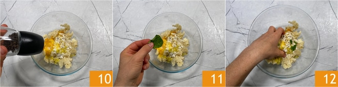Salpique sal, pimenta 10 e aromatize com folhas de hortelã picadas 11. Misture com as mãos para integrar bem o composto 12.