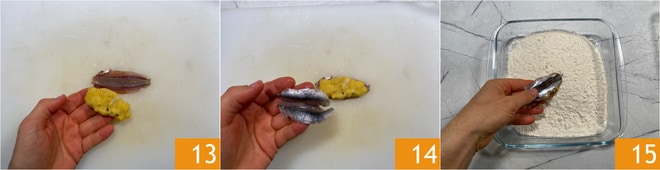 Coloque uma anchova por vez sobre a superfície de trabalho com a pele voltada para baixo, depois pegue uma pequena porção do recheio e espalhe-a na palma da mão até alcançar o mesmo tamanho da anchova 13. Coloque outra anchova sobre o recheio, desta vez com a pele voltada para cima, como se fosse um sanduíche 14. Continue assim com as outras anchovas. Depois de recheadas, empane as anchovas recheadas passando-as primeiro na farinha 15.
