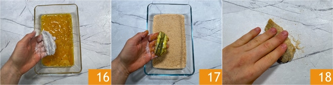Depois mergulhe-as nos ovos batidos com sal e pimenta 16 e, por fim, cubra-as com a farinha de rosca 17. Depois de empanadas, pressione delicadamente as anchovas recheadas para compactá-las 18.