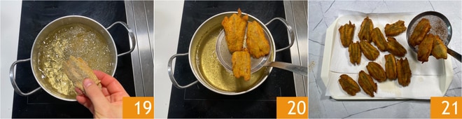 Você está pronto para fritar: aqueça o óleo a uma temperatura de 170°C e mergulhe poucos pedaços por vez 19. Após alguns minutos estarão douradas 20, então escorra em papel absorvente e continue fritando as outras 21. Sirva imediatamente suas anchovas recheadas com um esguicho de limão, se desejar 21!