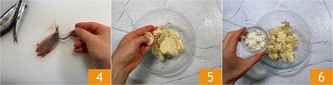 Remova a espinha central 4, lave bem e coloque-as abertas em um prato. Para detalhes adicionais, você pode consultar o guia "Como limpar as anchovas". Agora prepare o recheio: esmigalhe o miolo do pão com as mãos 5, depois adicione o queijo pecorino ralado 6.