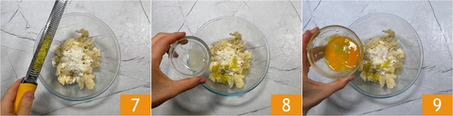 Adicione também a casca de limão 7, o suco 8 e o ovo 9.