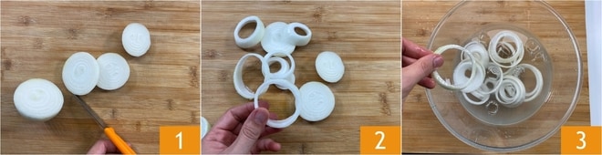 Para preparar os anéis de cebola, primeiro limpe as cebolas e corte-as em fatias de 1 cm de espessura 1; depois, sem quebrá-las, separe os anéis 2. Transfira-os para uma tigela com água e gelo 3 por 15 minutos. Este passo ajudará a suavizar o sabor das cebolas e a tornar os anéis mais crocantes.