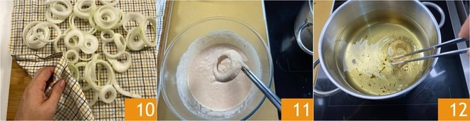 Passados os 15 minutos, escorra os anéis de cebola e seque-os bem com um pano de prato 10. Preste atenção a esta operação, pois se estiverem molhados, a massa pode se soltar durante a fritura; além disso, o óleo pode espirrar. Neste ponto, aqueça o óleo em uma panela, levando-o a uma temperatura de 170°. Pegue a massa e, com a ajuda de uma pinça, mergulhe o primeiro anel. Deixe escorrer o excesso de massa 11 e mergulhe-o no óleo quente 12.