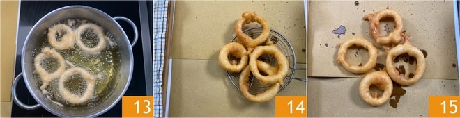 Continue assim, mergulhando poucos anéis de cada vez 13. Frite-os por cerca de 3 minutos, virando-os algumas vezes, até que fiquem bem dourados. Escorra em papel absorvente 14. Prossiga dessa forma até fritar todos e sirva-os ainda quentes 15.