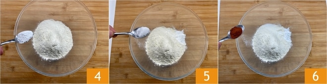 Enquanto isso, prepare a massa. Em uma tigela, coloque a farinha, o fermento 4, o sal 5 e a páprica 6.