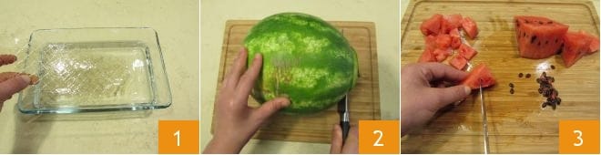 Para preparar o anel de melancia ao moscato, comece amolecendo a gelatina em água fria por pelo menos 10 minutos 1. Enquanto isso, pegue uma melancia e corte as extremidades 2, depois corte a polpa grosseiramente 3 e retire as sementes.