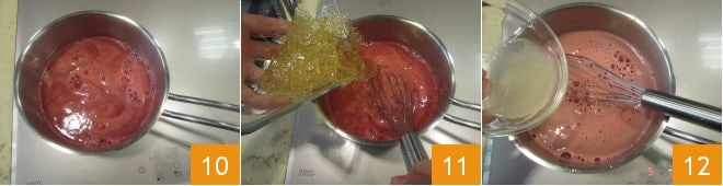 Em seguida, despeje os líquidos em uma panela de bordas altas e aqueça em fogo baixo 10. Adicione a gelatina já amolecida e bem espremida 11 e o suco de limão 12.