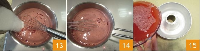 Adicione também o açúcar e misture os ingredientes para incorporá-los 14. Para que os ingredientes se dissolvam, levará cerca de 5-6 minutos. Em seguida, despeje a mistura em uma forma em formato de anel com capacidade de 1,5 kg 15.