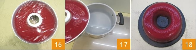 Cubra com filme plástico transparente 16 e transfira para a geladeira para firmar por pelo menos 12 horas. Após esse tempo, encha metade de uma panela com água. É importante que a panela tenha uma circunferência ligeiramente maior do que a forma em formato de anel onde você despejou a mistura. Leve a água para ferver e coloque a forma com a preparação sobre ela 17, para que o calor permita soltar a sobremesa da forma. Isso levará apenas alguns segundos. Em seguida, retire a forma da panela com a ajuda de espátulas, coloque um prato de servir sobre a forma e vire ambos simultaneamente sobre uma superfície plana. Retire então a forma e sirva seu anel de melancia ao moscato 18! Se preferir, pode servi-lo acompanhado de alguns pedaços de melancia ou frutas vermelhas.