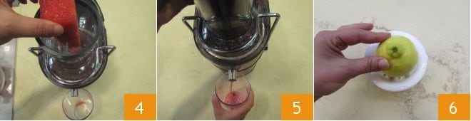 Coloque os pedaços de melancia em uma centrífuga para separar a polpa do suco da fruta 4: você obterá 1,3 kg de suco de melancia 5: reserve. Agora esprema o limão 6.