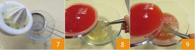Coe o suco de limão com uma peneira de malha fina 7 e reserve também. Agora pegue uma tigela grande e despeje o moscato e o suco de melancia 8. Com a ajuda de batedores de mão, misture os ingredientes 9.
