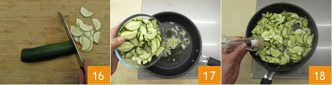 e depois em fatias 16, de modo a obter meias-luas. Em uma frigideira, coloque um fio de óleo, adicione a cebola e deixe-a murchar. Depois adicione as abobrinhas 17 e ajuste o sal e a pimenta 18.