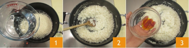 Para preparar os arancini com ragu de feijão vermelho, comece cozinhando o arroz. Toste-o por um instante em uma caçarola, depois cubra com água 1 e cozinhe até que o composto esteja bem seco 2. No meio do cozimento, adicione o açafrão diluído em um pouco de água e ajuste o sal 3.