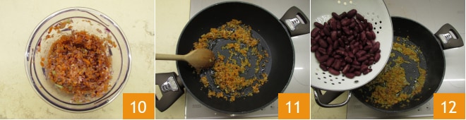 Uma vez pronto um triturado bem fino 10, refogue-o na caçarola com um pouco de óleo 11. Após alguns minutos, adicione os feijões pré-cozidos, lavados e escorridos 12.