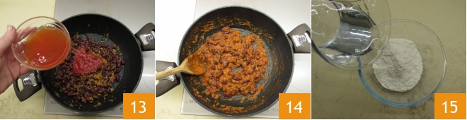 Finalmente, adicione o purê de tomate diluindo-o com um pouco de água 13, dessa maneira você poderá cozinhar em fogo baixo por cerca de vinte minutos; ajuste o sal e a pimenta 14. Prepare também a massa, colocando em uma tigela a farinha e a água 15.