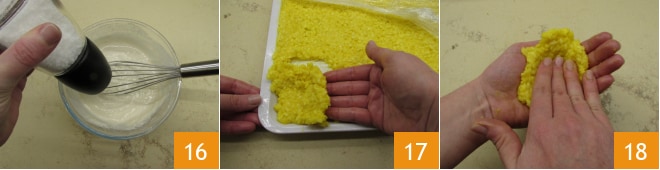 Trabalhe bem com um batedor para obter um composto fluido e sem grumos, tempere com uma pitada de sal 16 e passe à formação dos arancini. Com as mãos untadas, pegue uma porção da massa, 12 no total, 17 e na mão forme uma pequena cova 18.