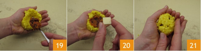 No meio, adicione um pouco de ragu de feijão 19 e um cubo de queijo de coalho 20. Feche bem 21