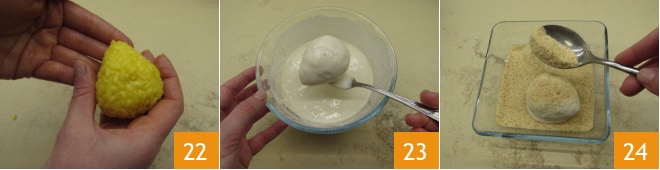 e modele a ponta, aqui está o primeiro pronto 22. Continue assim com todos os outros e então mergulhe um de cada vez na massa 23. Depois, escorra e passe na farinha de rosca 24.