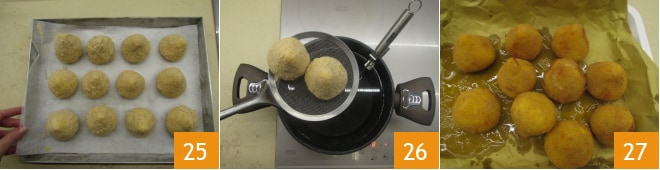 Quando todos os arancini estiverem prontos 25, vá para o fogão. Aqueça o óleo a 170°C e quando estiver na temperatura, adicione os arancini, deixando-os cozinhar por alguns minutos 26. Uma vez dourados, escorra os arancini com ragu de feijão vermelho e bom apetite 27.