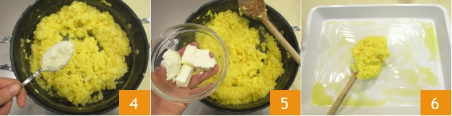 Quando o arroz estiver pronto, com o fogo desligado, adicione o queijo ralado 4 e alguns pedaços de manteiga 5. Misture até absorver completamente e transfira tudo para um recipiente untado 6.