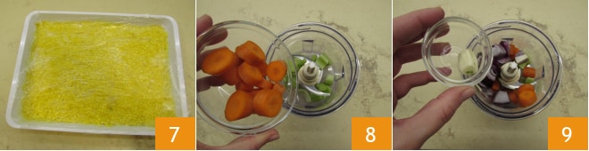Achatine o arroz, cubra e deixe esfriar por um par de horas em temperatura ambiente 7. Enquanto isso, prepare o ragu de feijão vermelho. No processador, triture rapidamente o aipo, a cenoura 8, a cebola roxa e o dente de alho 9.