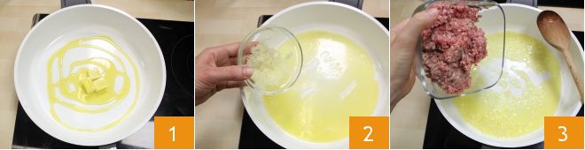 Para realizar os arancini de espaguete comece pela preparação do ragù de carne: em uma frigideira antiaderente derreta, em fogo baixo, a manteiga com um pouco de óleo 1, em seguida adicione a cebola finamente picada 2 e refogue por alguns minutos. Quando a cebola estiver murcha, adicione a carne moída e refogue em fogo alto por 5 minutos 3;